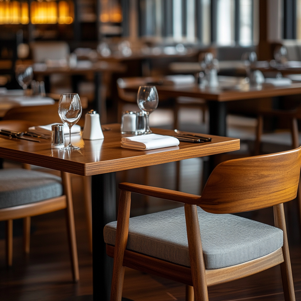 Even the strongest wood will deteriorate quickly if it is not protected by a high-quality finish. Commercial finishes such as polyurethane (PU), nitrocellulose lacquer, or advanced water-based coatings shield the wood from moisture, cleaning chemicals, and surface abrasion. Restaurants should look for finishes that are smooth, evenly applied, and designed specifically for high-traffic environments. Inferior coatings tend to peel or fade, exposing the wood to potential damage.