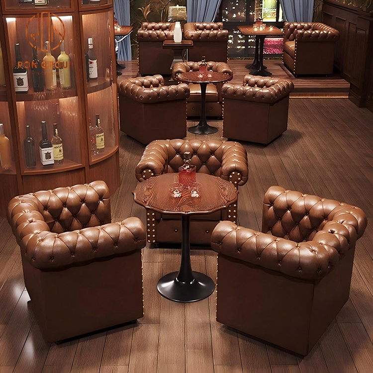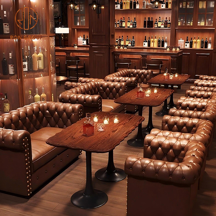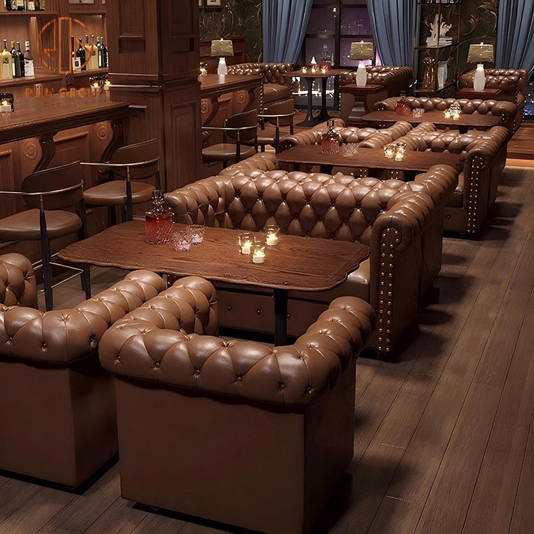 Vintage Restaurant Cafe Furniture Brown Leather Sofa Couch Bench Booth with Tufting and Nailhead Details with Wood Dining Table