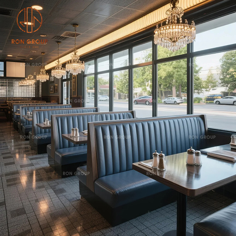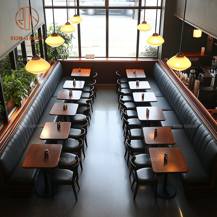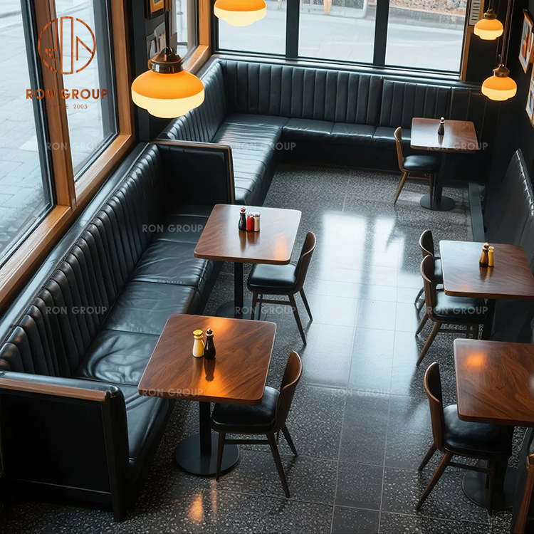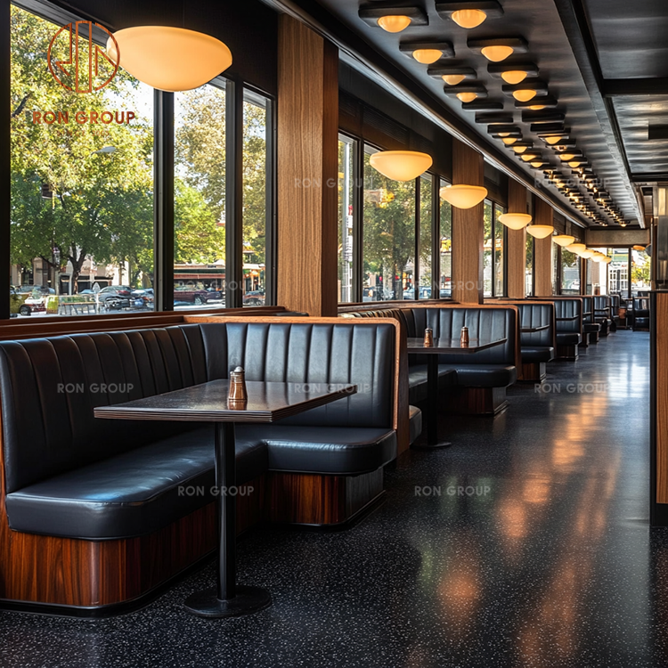 Black Leather Banquette Seating with Wood Tables for Classic American Restaurant Layouts