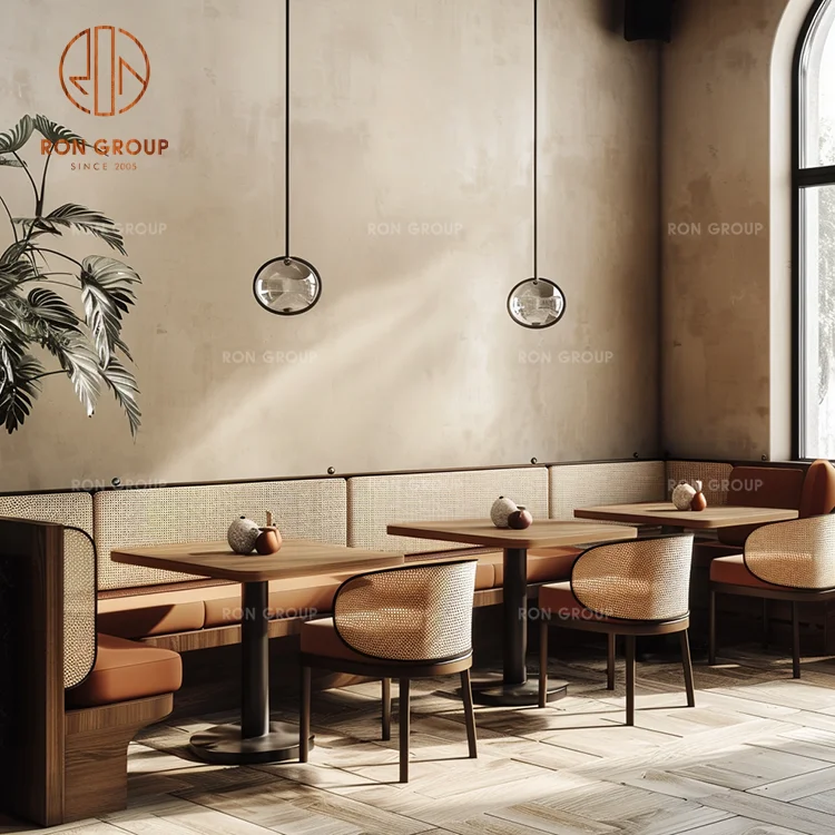 Modern Café Dining Furniture Set with Fabric Banquette Seating and Rattan Chairs