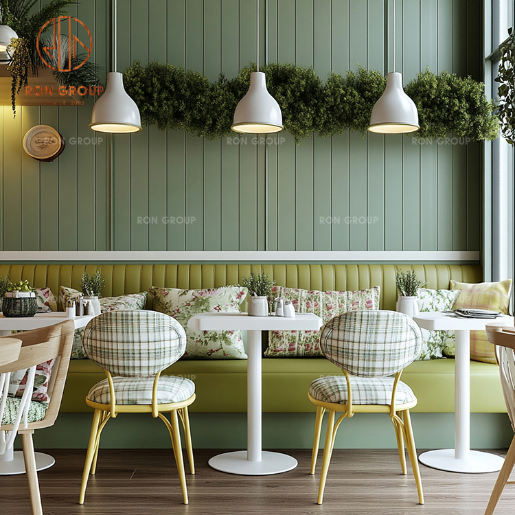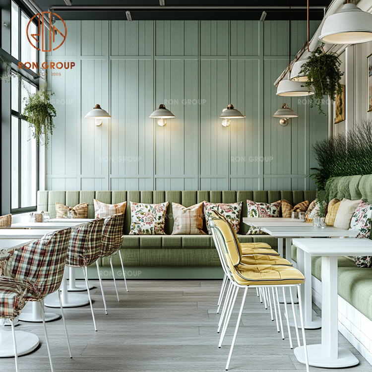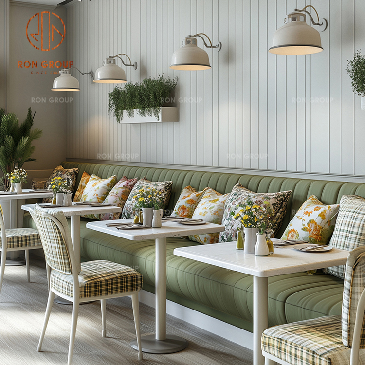 Green Fabric Booth Seating with Square Tables and Cafe Chairs for Restaurant