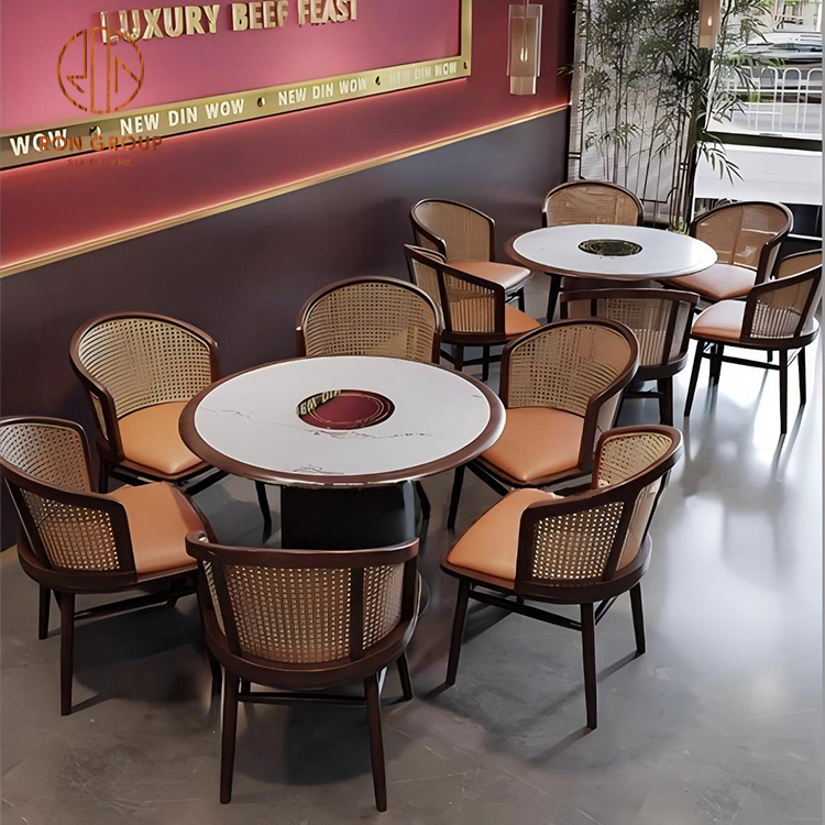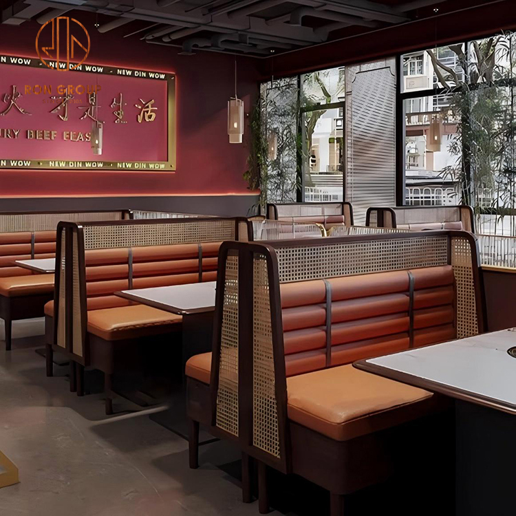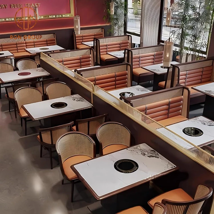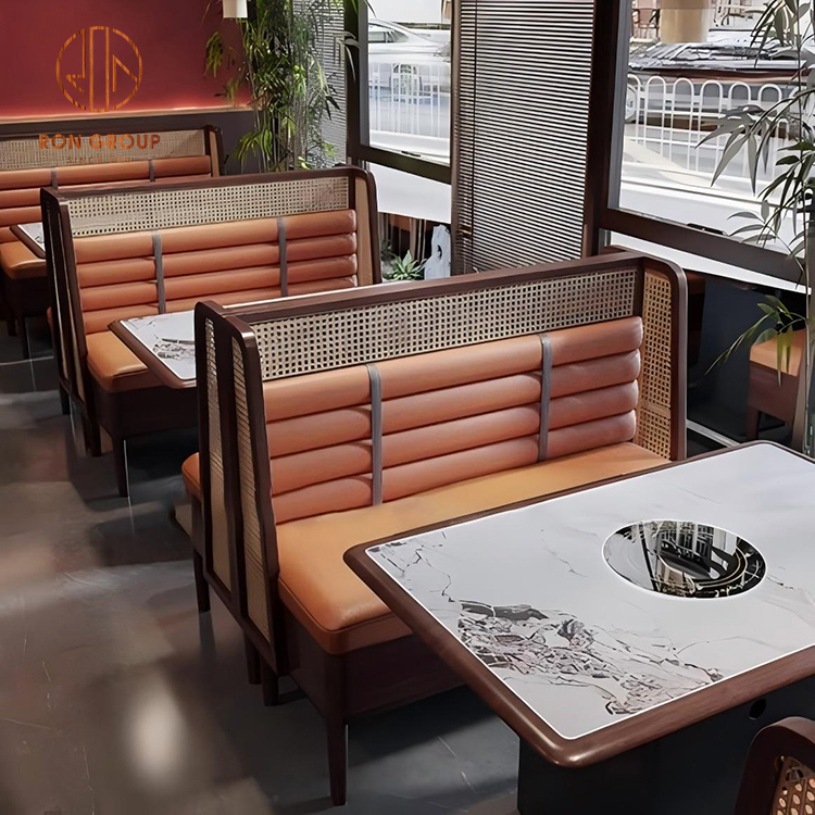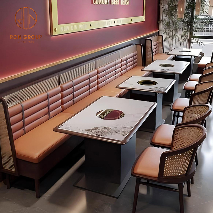 Marble Hot Pot Table with Leather Booth Seating and Rattan Chairs for Restaurant