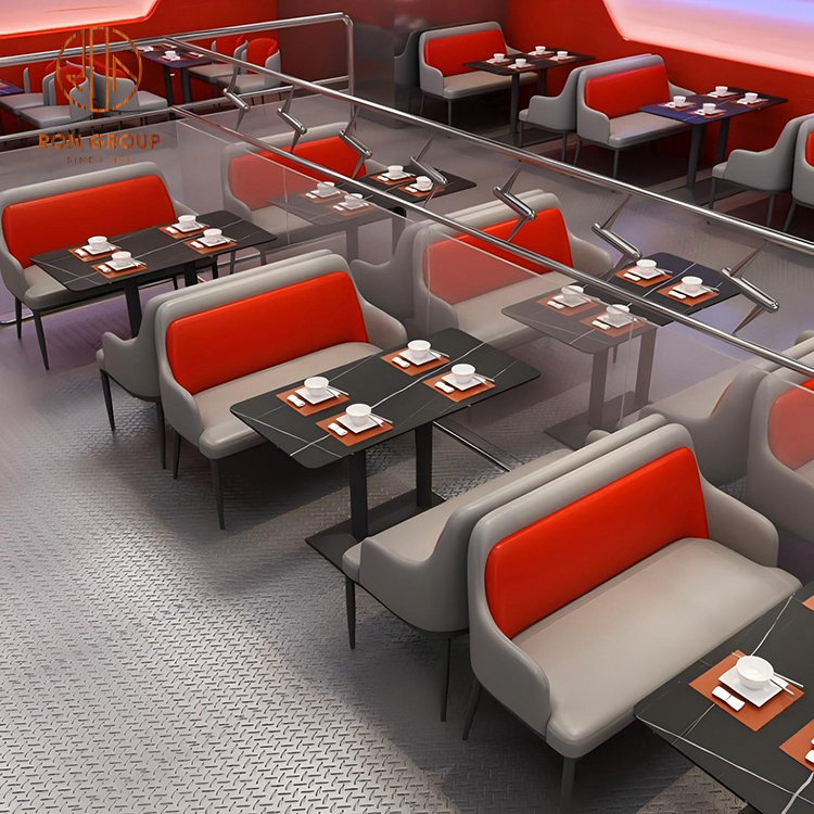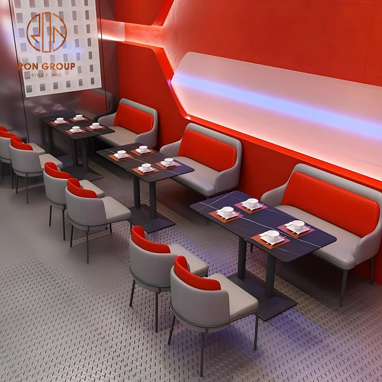 Modern Cafe Booth Seating Set with Red Sofa, Dark Rectangular Tables and Leather Chairs