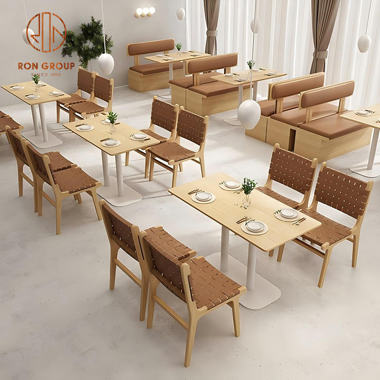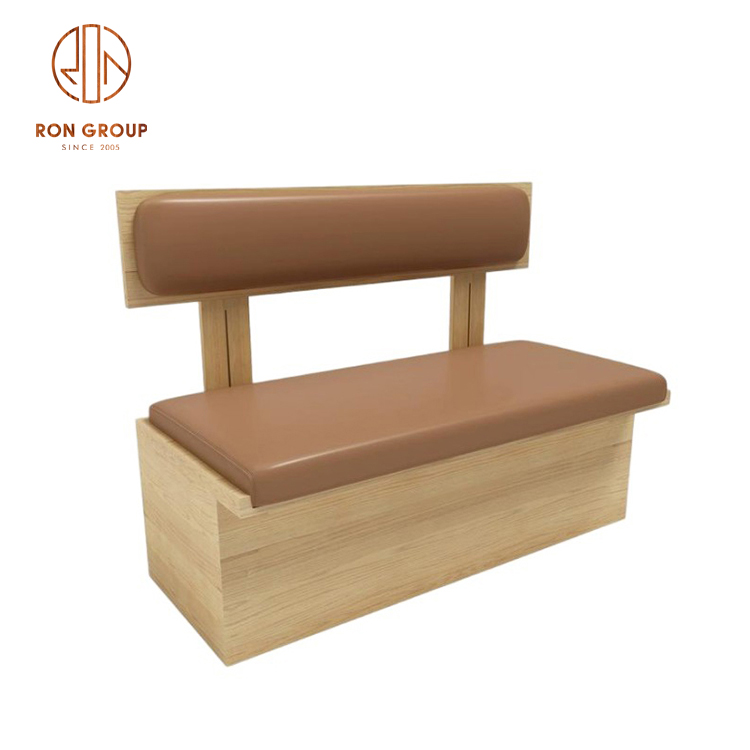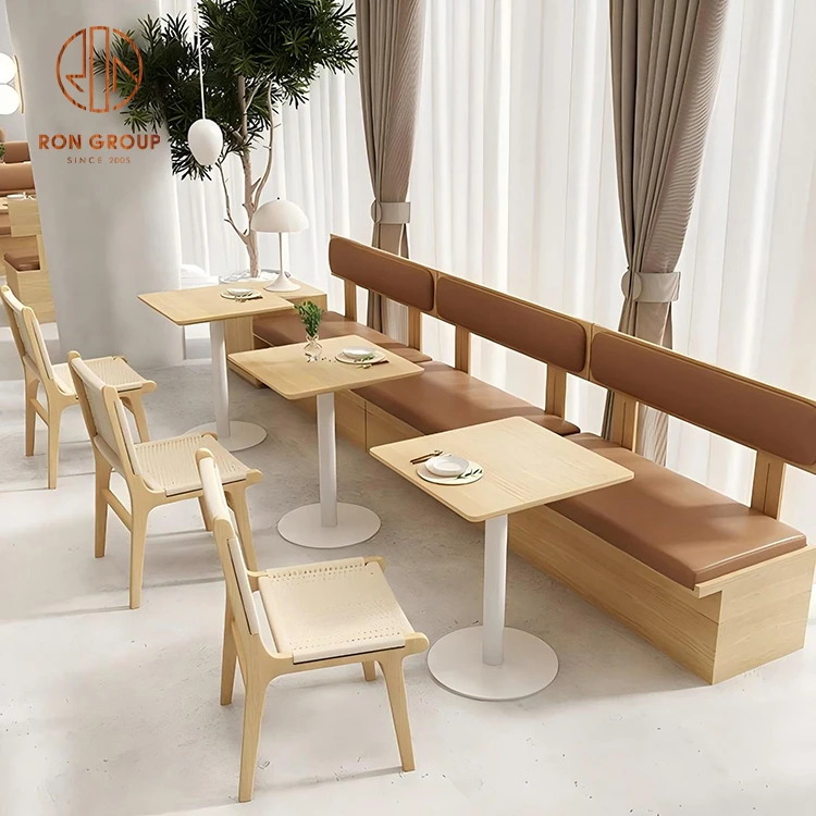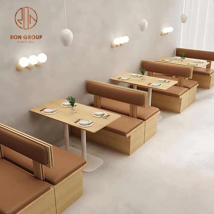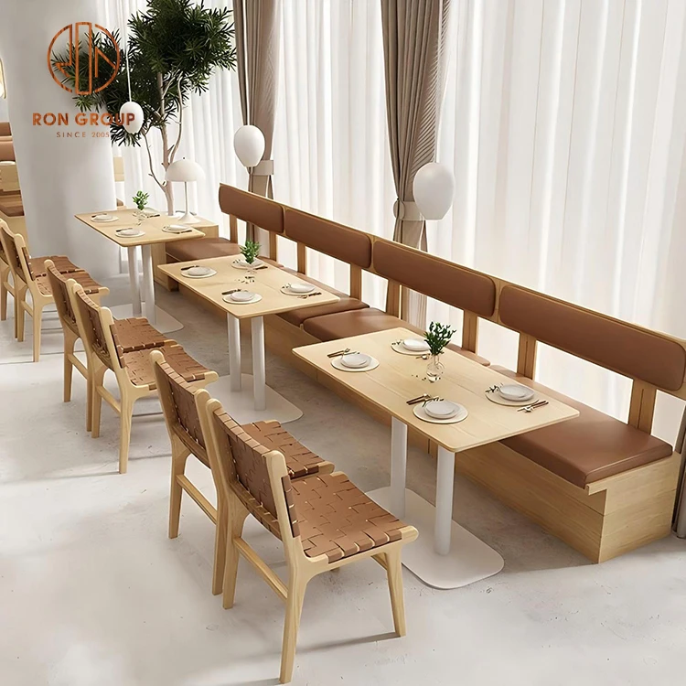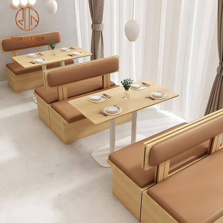Wood Frame Cafe Booth Seating with Brown Leather Cushions and Dining Tables