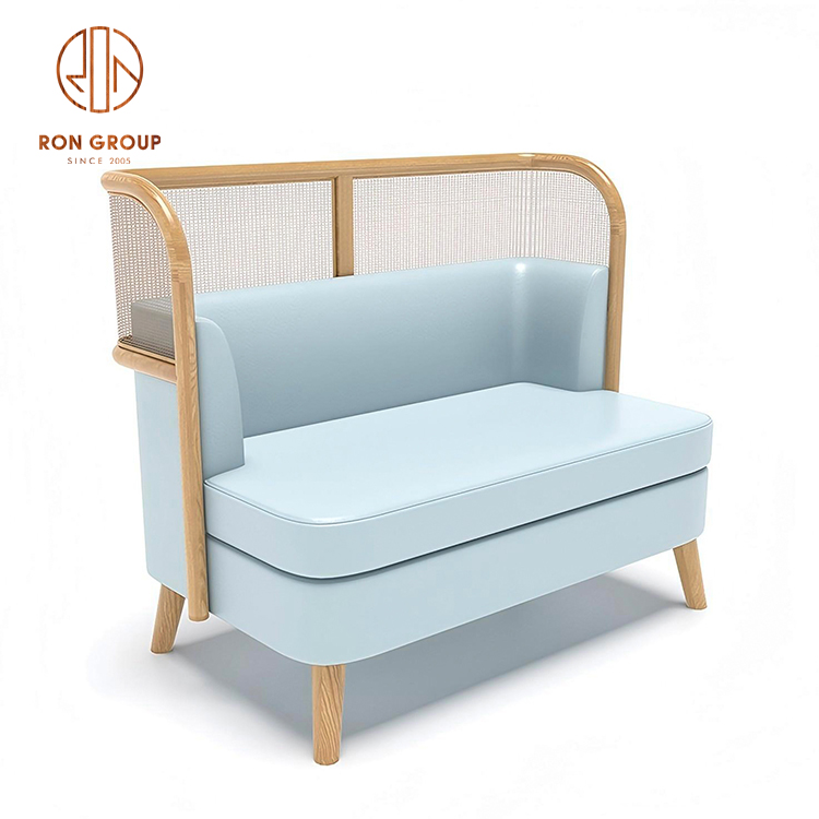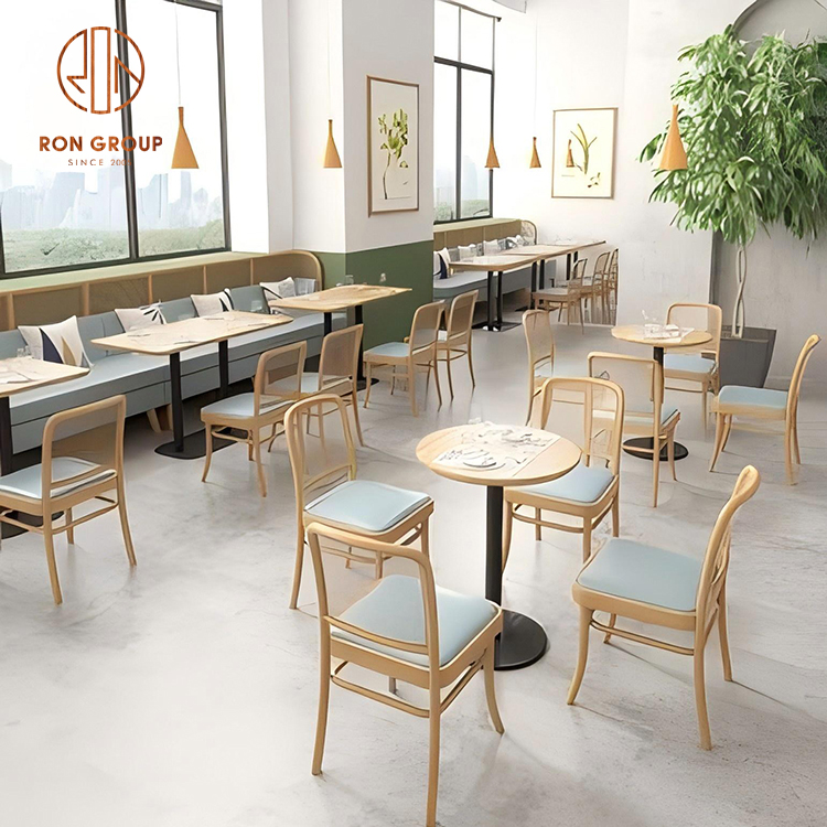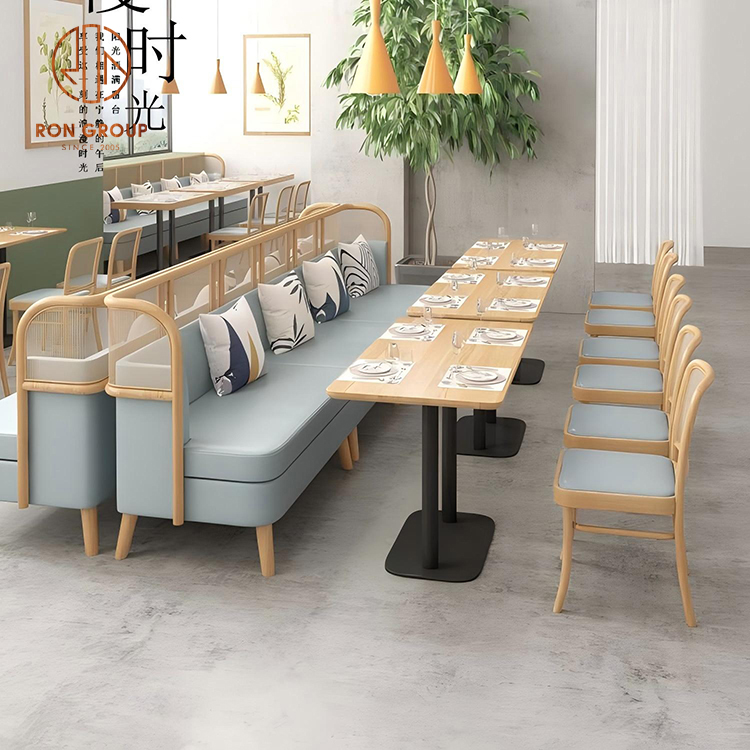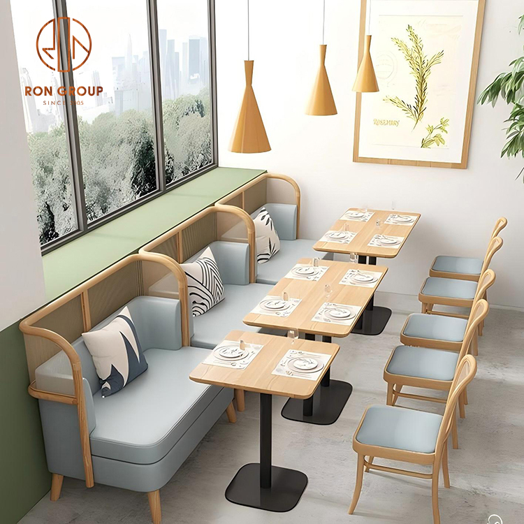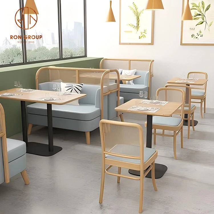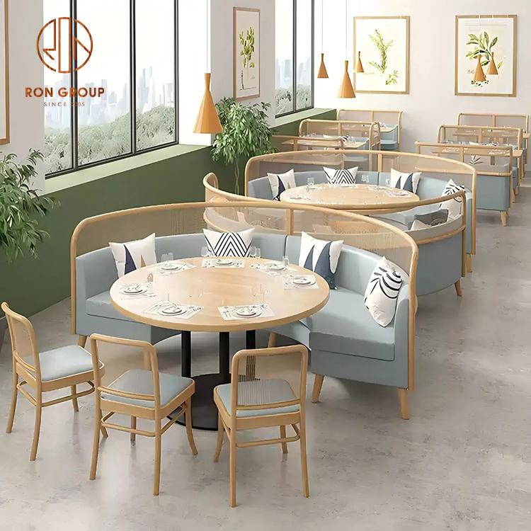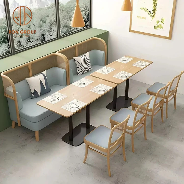 Wood Cafe Booth Seating with Square Dining Tables and Rattan Chairs