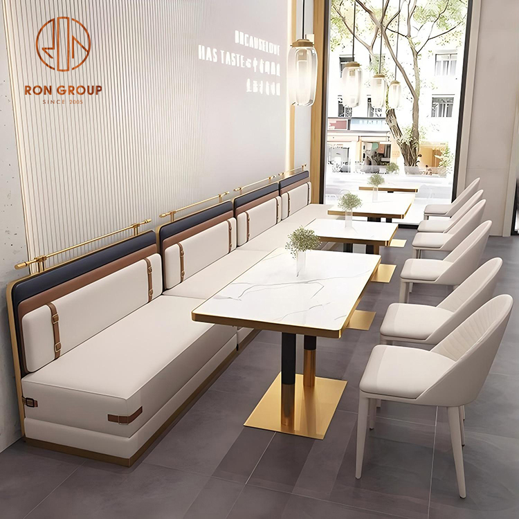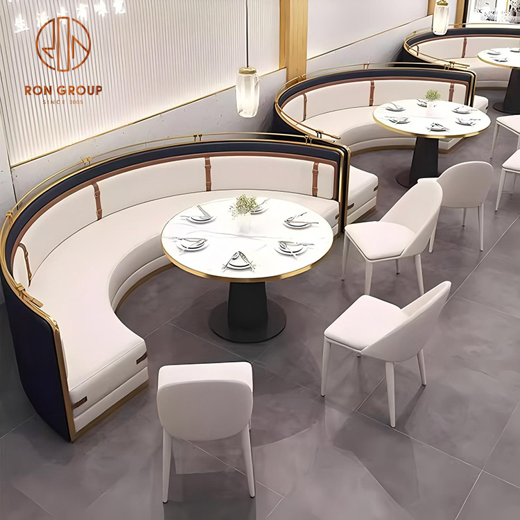 Luxury Light-Extravagance Restaurant Furniture: Beige Leather Booths with Gold Trim & Marble Dining Tables