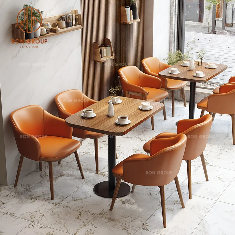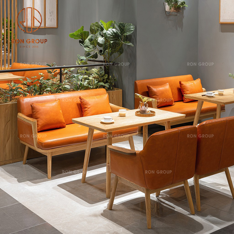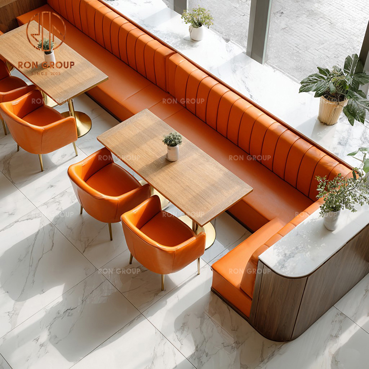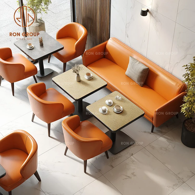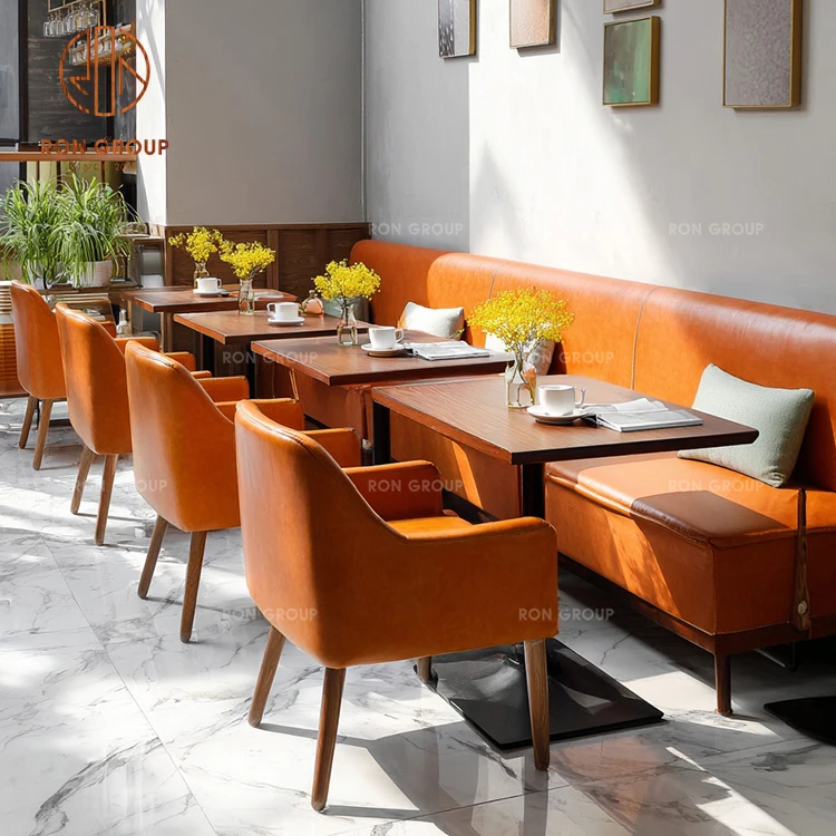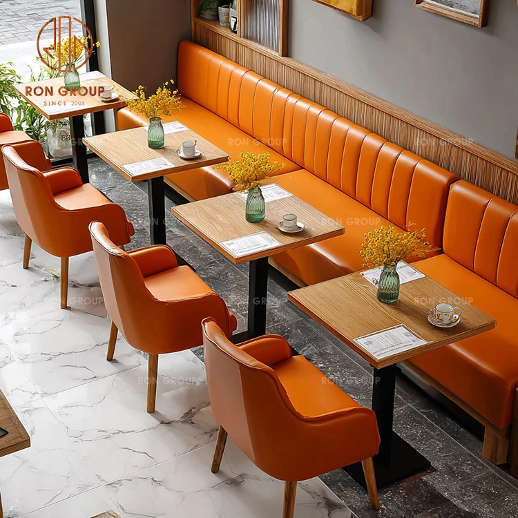 Vibrant Modern Cafe Furniture Set: Orange Genuine Leather Sofa Booth, Wooden Square Tables & Matching Upholstered Chairs